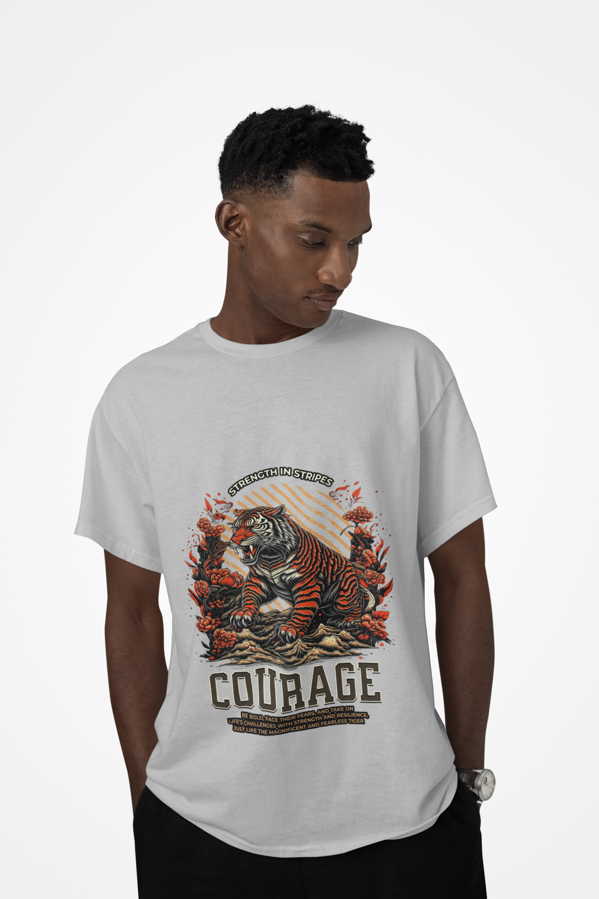 A soft, sturdy tee with a bold, vintage-style graphic that asks you to stand tall. The front features an illustrated tiger framed by autumnal foliage and sunburst rays, anchored by the word “COURAGE.” The medium-weight cotton holds the print detail clean and crisp, while a classic crew neckline and relaxed fit make it easy to layer or wear solo. It feels lived-in from the first wear — quiet strength you can reach for on mornings you need a little extra grit.