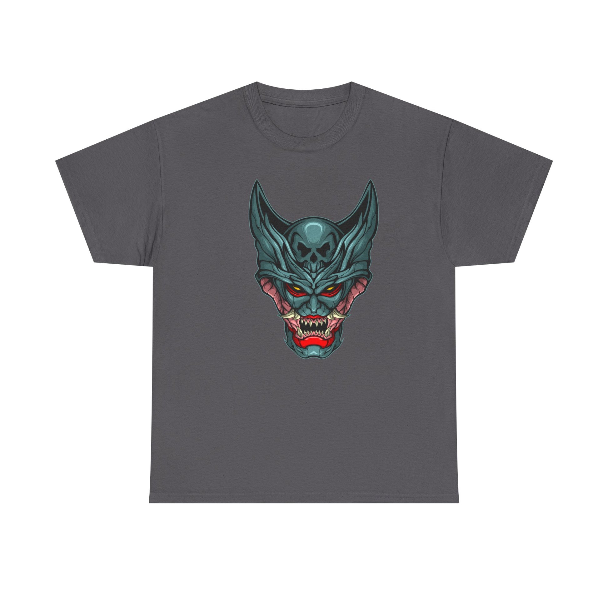 This classic crewneck tee brings bold edge to everyday wear. The shirt features a striking, demon-inspired mask graphic centered on the chest — sharp teal horns, a cracked skull motif, and saturated red accents give it a dark, graphic energy. The relaxed, boxy silhouette and medium-weight cotton keep the piece grounded and wearable. It sits like a reliable staple in a streetwear rotation: layer it under a denim jacket for an evening out, wear it with relaxed trousers for a show or gallery opening, or pair it with lived-in jeans for weekend wandering. The design reads like underground art — unmistakably rebellious, quietly crafted, and built to age with the wearer.