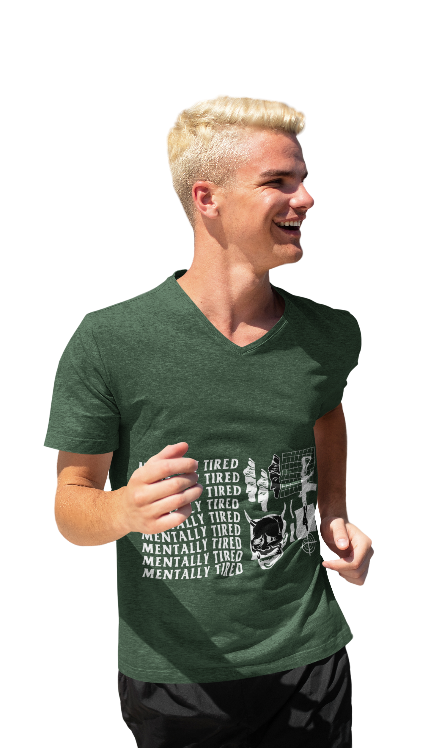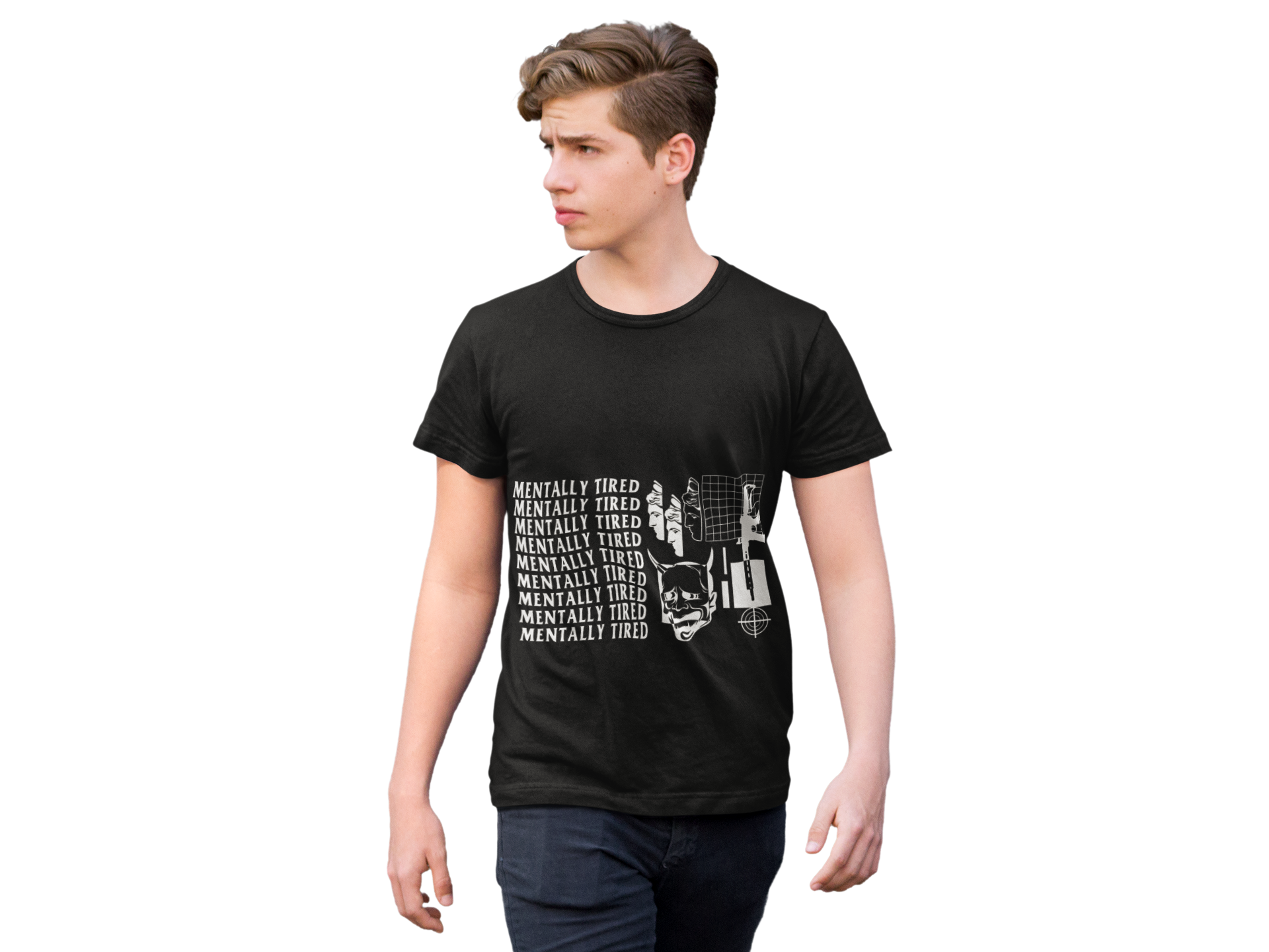 A bold, low-key black tee that speaks without shouting. The front print layers stark white text — repeated “MENTALLY TIRED” — with fragmented, collage-style graphics: a moody mask, abstract grid, and analog tech motifs. It feels like a late-night sketchbook crossed with static on an old TV — quiet, honest, a little raw. Wear it on long shifts, late study sessions, or nights when you want your mood to read loud but your voice to stay calm. The classic crew cut and relaxed fit let the design do the talking, while sturdy cotton and clean seams keep it comfortable through repeat wears. This shirt blends into a minimalist, underground wardrobe and pairs naturally with worn denim, hoodies, or layered jackets for cooler evenings.