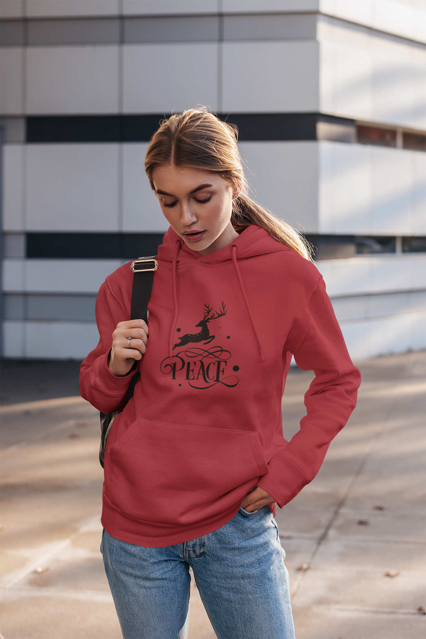 Soft, cozy, and quietly festive — this hooded sweatshirt wraps you in calm. A graceful leaping reindeer and the word "PEACE" are printed in an elegant, hand-lettered style that feels like a gentle exhale on a winter evening. The roomy kangaroo pocket and double-lined, color-matched hood make it an easy go-to for slow mornings, tree-lighting nights, or curling up with a mug by the window. It sits comfortably over layers, holds its shape, and carries a subtle, stylish nod to seasonal stillness without shouting for attention.