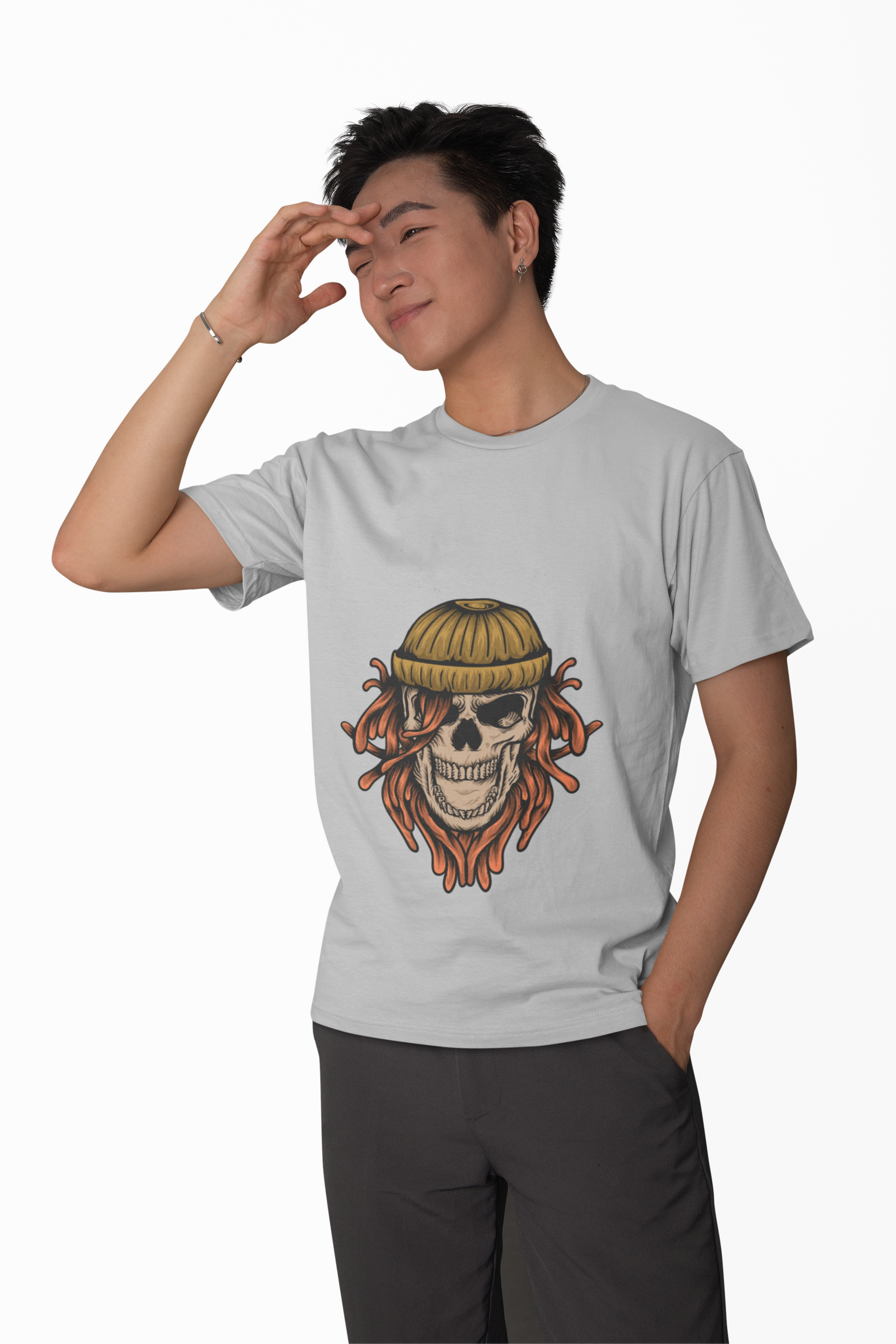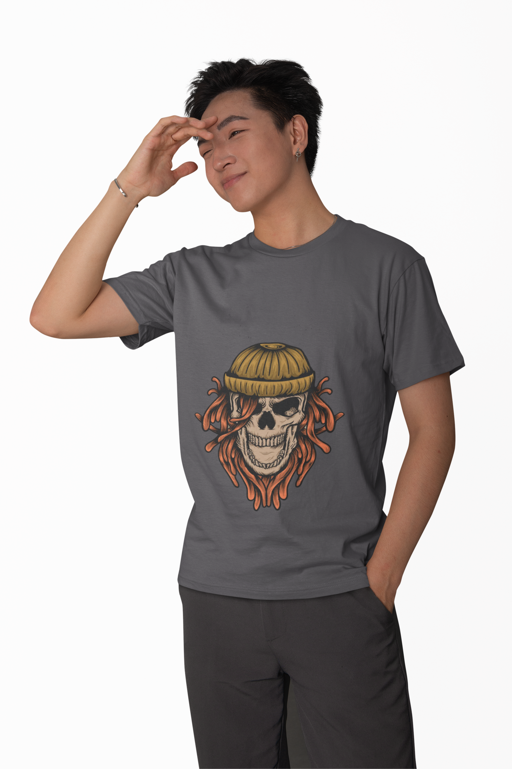 A rugged, art-forward tee for people who live on the edge of the map. This cotton shirt features a hand-drawn skull wearing a knit beanie, its hair rendered like drifting seaweed or embered roots — a design that feels equal parts coastal castaway and campfire storyteller. The medium-weight cotton holds crisp color for every fine line, while a classic crew cut and relaxed fit make it easy to layer under a flannel or wear on its own. Wear it when you're headed to a night ride, a bonfire by the rocks, or just to pull on and feel a little wilder than usual.