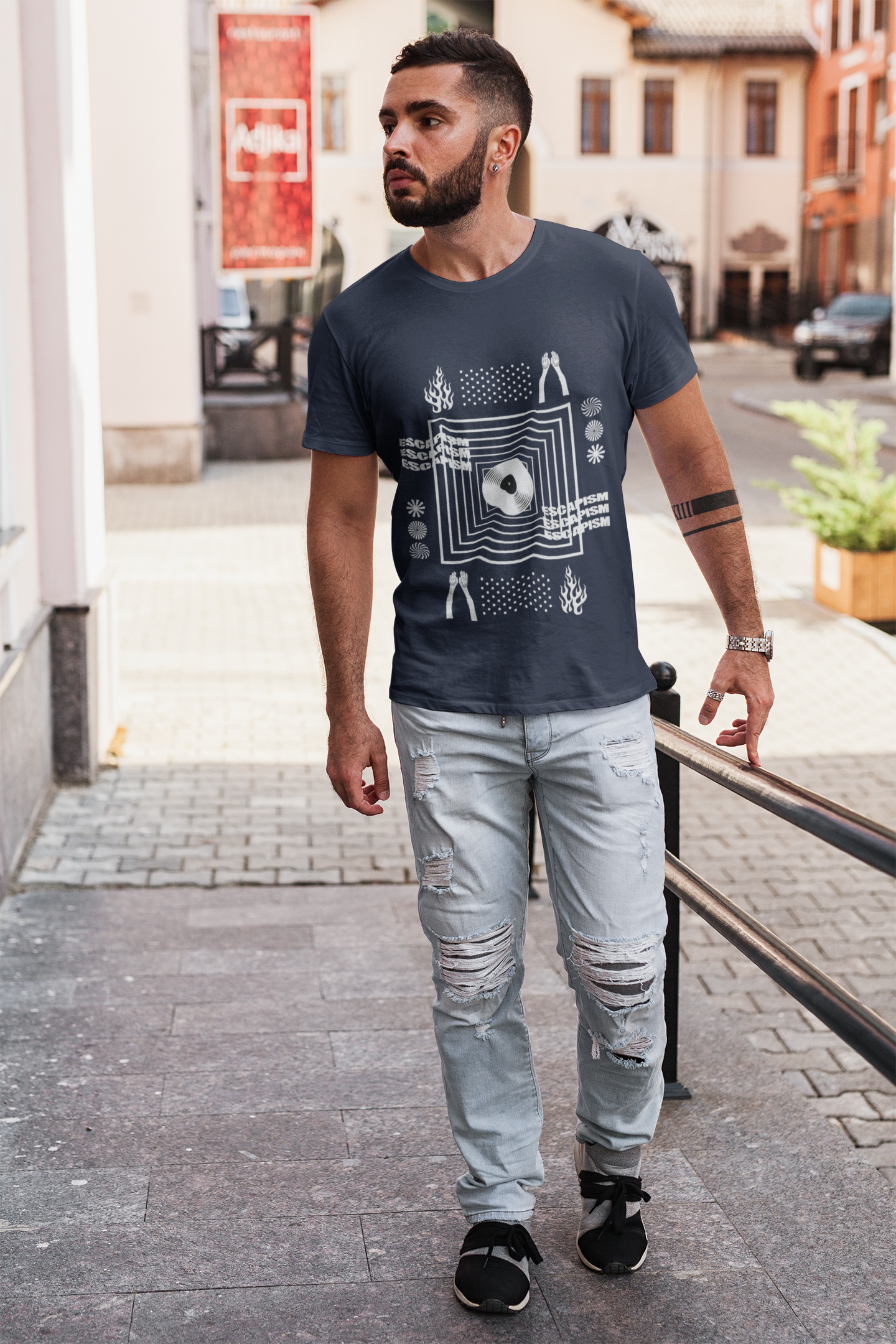 This black cotton tee carries an offbeat, slightly industrial design that reads like a mixtape for the mechanically curious. Concentric square lines draw the eye to a central vinyl record, while scattered icons — flame motifs, pliers, dotted halftone clusters and small gear-like suns — give the shirt a DIY, synth-noir energy. It feels like a late-night studio session: loud, focused, a little bit dangerous. Wear it to shows, to build nights, or when you want your outfit to sound as bold as your playlist. The relaxed crew neck and classic fit let the artwork sit front-and-center without fuss. The subtle natural flecks in lighter colors add texture; in black the print pops with stark, high-contrast clarity.